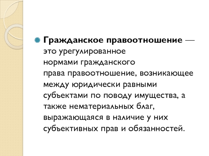 Слайд 9Гражданское правоотношение — это урегулированное нормами гражданского права правоотношение, возникающее между юридически равными субъектами