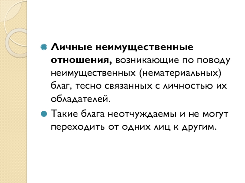 Личные неимущественные отношения, возникающие по поводу неимущественных (нематериальных) благ, тесно связанных с личностью их обладателей. Такие блага неотчуждаемы