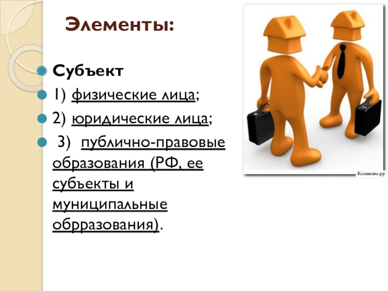 Элементы:  Субъект 1) физические лица; 2) юридические лица; 3)  публично-правовые образования (РФ, ее субъекты и муниципальные обрразования).