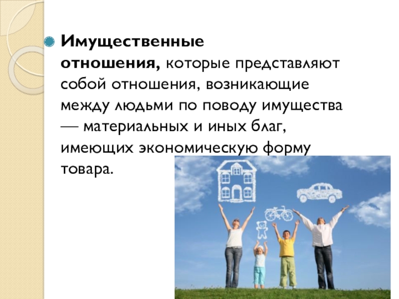 Слайд 5Имущественные отношения, которые представляют собой отношения, возникающие между людьми по поводу имущества