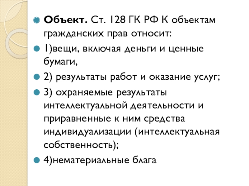 Объект. Ст. 128 ГК РФ К объектам гражданских прав относит:1)вещи, включая деньги и ценные бумаги,2) результаты работ