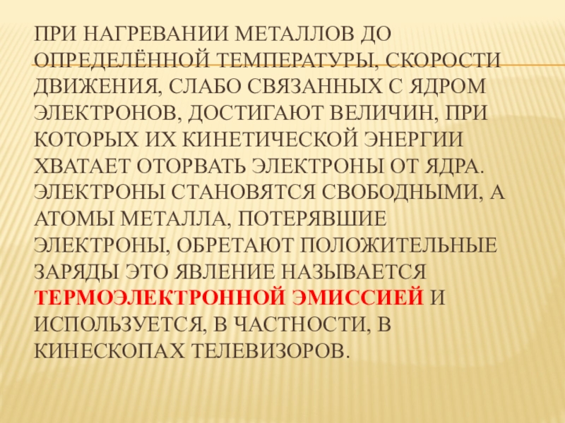 ядром электронов, достигают величин, при которых их кинетической энергии хватает оторвать электроны от ядра. Электроны становятся свободными, а атомы металла, потерявшие электроны, обретают положительные заряды Это явление называется термоэлектронной эмиссией и используется, в частности, в кинескопах телевизоров.