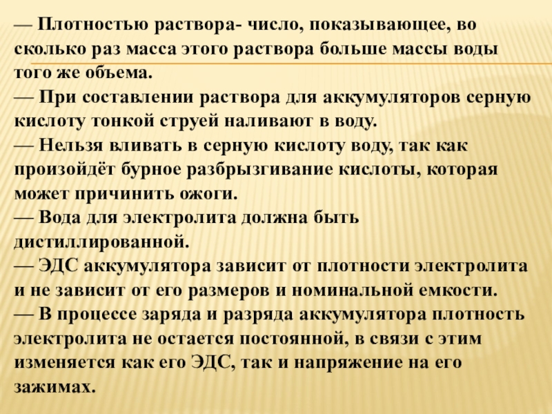 — ЭДС аккумулятора зависит от плотности электролита и не зависит от его размеров и номинальной емкости.