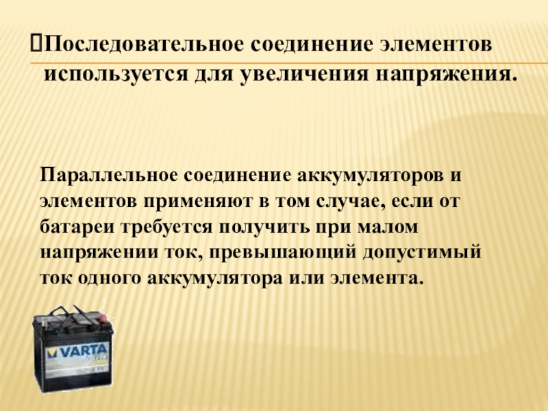 Слайд 94Последовательное соединение элементов используется для увеличения напряжения.