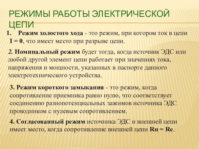 4. Согласованный режим источника ЭДС и внешней цепи имеет место, когда сопротивление внешней цепи Rн = Rе.
