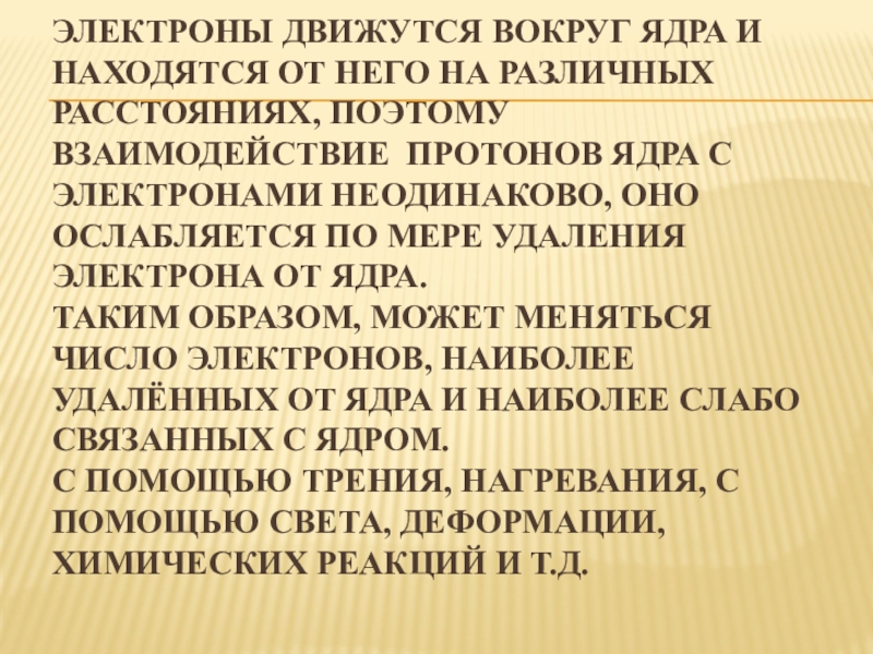 Слайд 9Электроны движутся вокруг ядра и находятся от него на различных расстояниях,