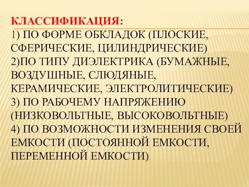 1) по форме обкладок (плоские, сферические, цилиндрические)