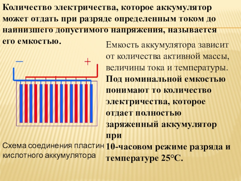 Слайд 89Количество электричества, которое аккумулятор может отдать при разряде определенным током до