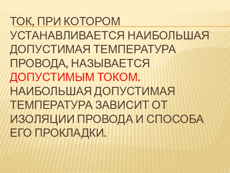 Слайд 73Ток, при котором устанавливается наибольшая допустимая температура провода, называется допустимым током.
