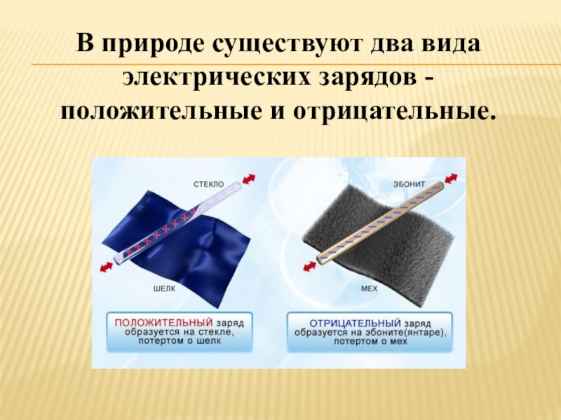 Слайд 15В природе существуют два вида электрических зарядов - положительные и отрицательные.