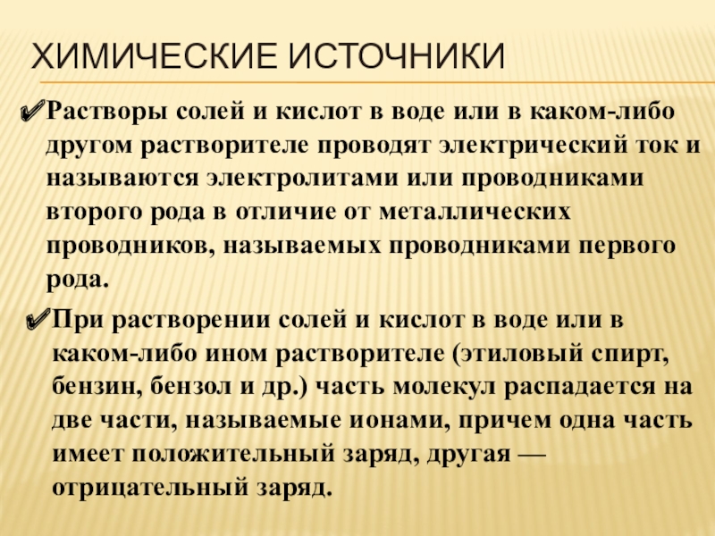 При растворении солей и кислот в воде или в каком-либо ином растворителе (этиловый спирт, бензин, бензол и др.) часть молекул распадается на две части, называемые ионами, причем одна часть имеет положительный заряд, другая — отрицательный заряд.