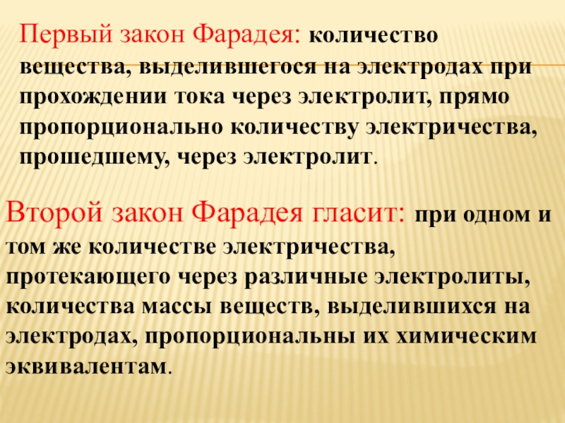 Слайд 82Первый закон Фарадея: количество вещества, выделившегося на электродах при прохождении тока