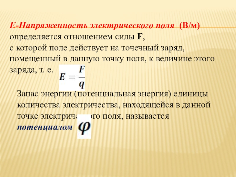 Слайд 22Е-Напряженность электрического поля (В/м) определяется отношением силы F,