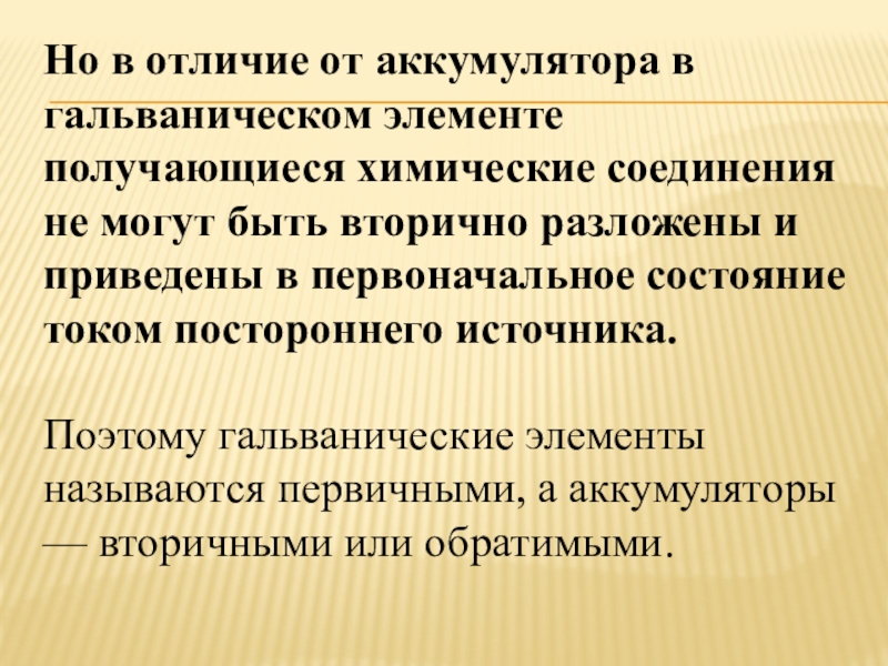 Слайд 86Но в отличие от аккумулятора в гальваническом элементе получающиеся химические соединения