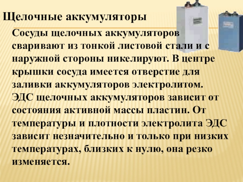 ЭДС щелочных аккумуляторов зависит от состояния активной массы пластин. От температуры и плотности электролита ЭДС зависит незначительно и только при низких температурах, близких к нулю, она резко изменяется.