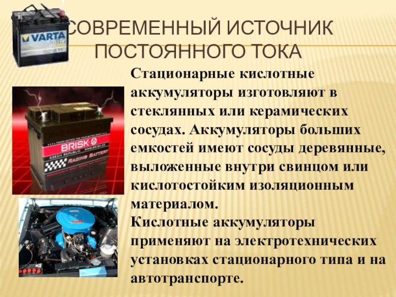 Кислотные аккумуляторы применяют на электротехнических установках стационарного типа и на автотранспорте.