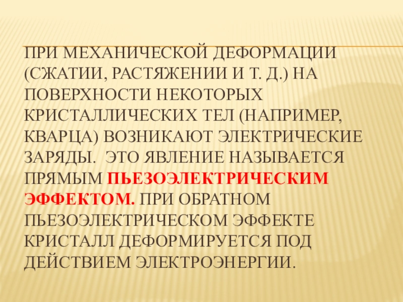 кристаллических тел (например, кварца) возникают электрические заряды. Это явление называется прямым пьезоэлектрическим эффектом. При обратном пьезоэлектрическом эффекте кристалл деформируется под действием электроэнергии.