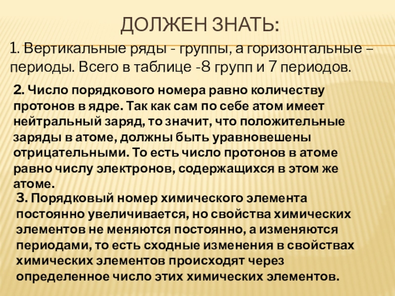 3. Порядковый номер химического элемента постоянно увеличивается, но свойства химических элементов не меняются постоянно, а изменяются периодами, то есть сходные изменения в свойствах химических элементов происходят через определенное число этих химических элементов.