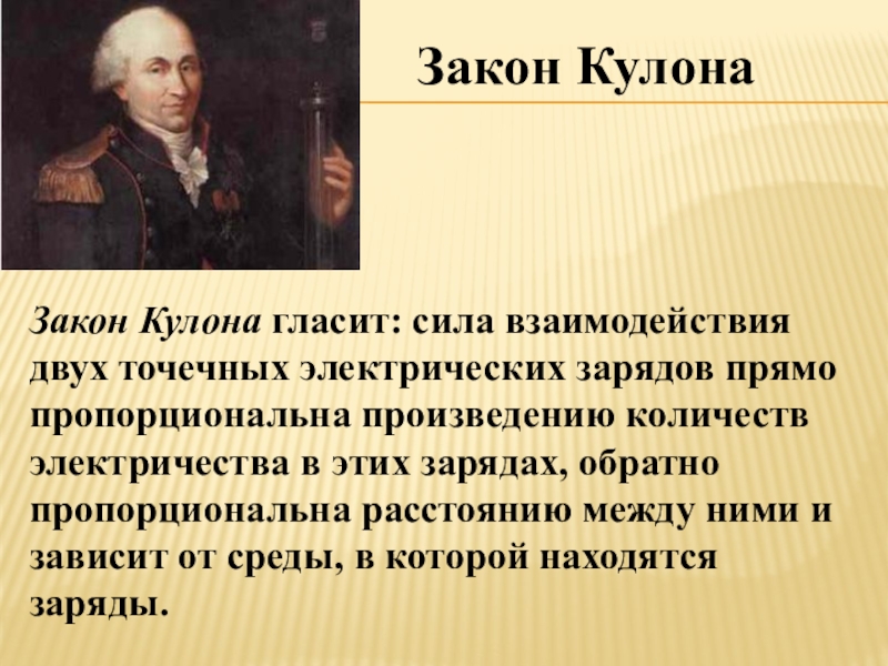 Слайд 17Закон Кулона гласит: сила взаимодействия двух точечных электрических зарядов прямо пропорциональна