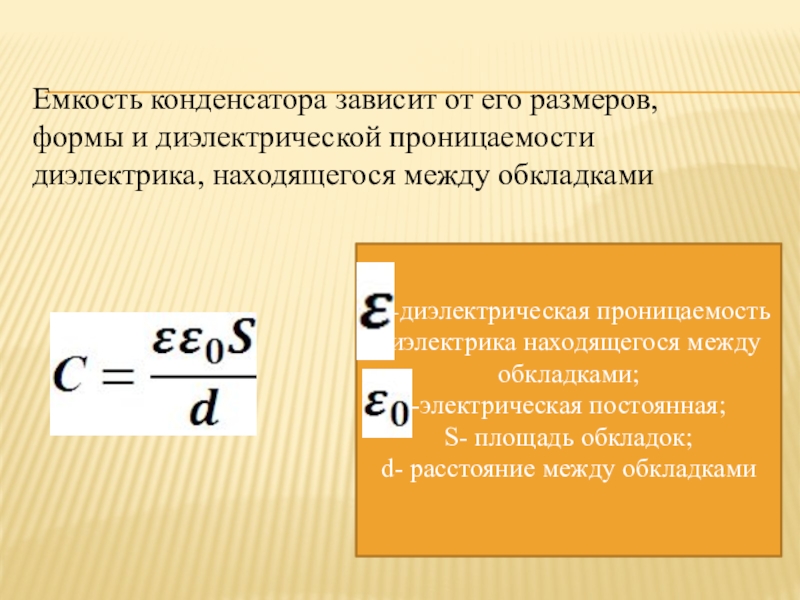 Слайд 28Емкость конденсатора зависит от его размеров, формы и диэлектрической проницаемости диэлектрика,