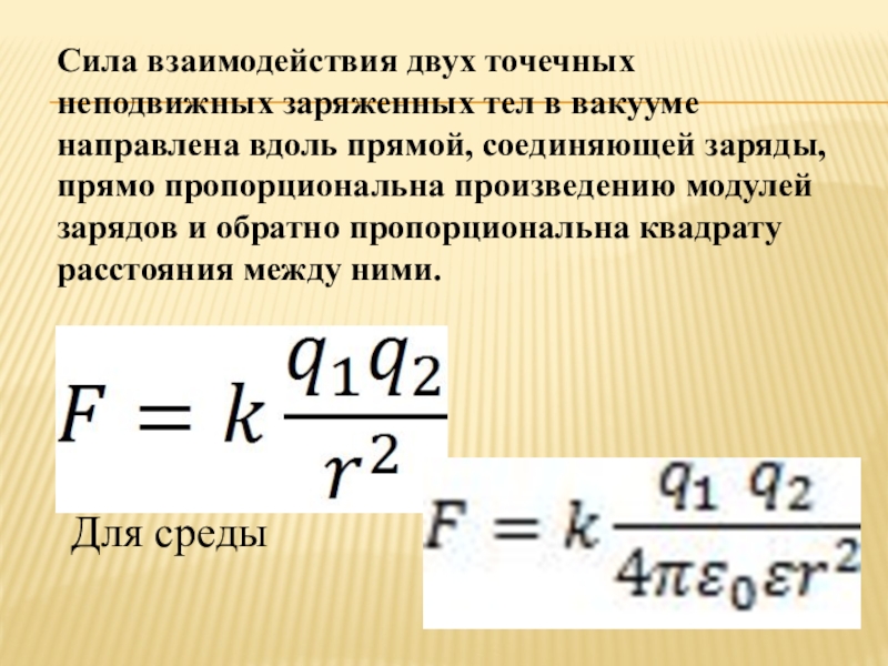 прямой, соединяющей заряды, прямо пропорциональна произведению модулей зарядов и обратно пропорциональна квадрату расстояния между ними.