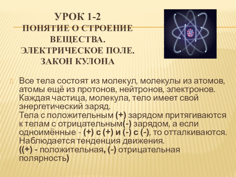 «Понятие о строение вещества. Электрическое поле. Закон Кулона»