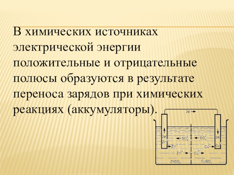 Слайд 13В химических источниках электрической энергии положительные и отрицательные полюсы образуются в