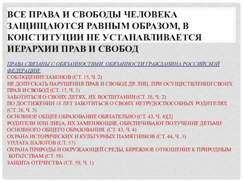 Слайд 19Все права и свободы человека защищаются равным образом, в Конституции не