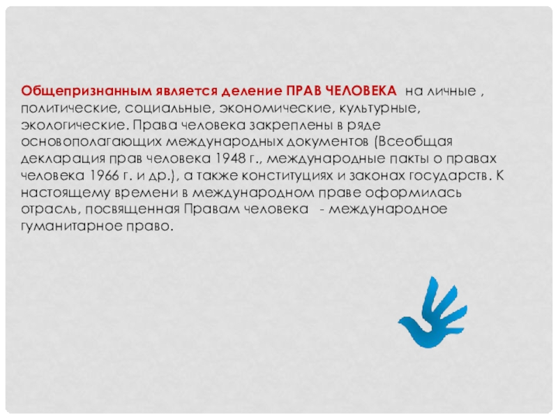 Слайд 14Общепризнанным является деление ПРАВ ЧЕЛОВЕКА на личные , политические, социальные, экономические,
