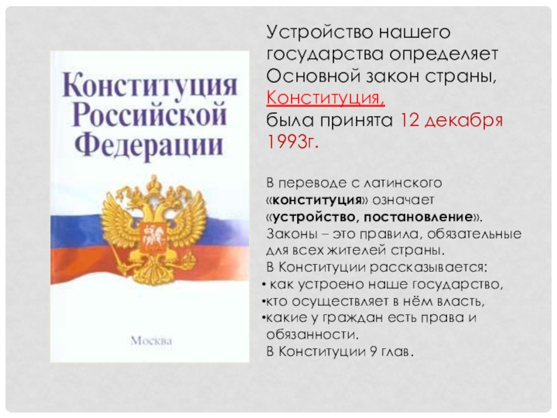 В переводе с латинского «конституция» означает «устройство, постановление».
