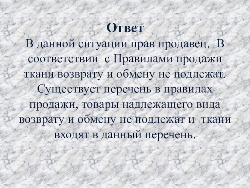 В данной ситуации прав продавец. В соответствии с Правилами продажи ткани