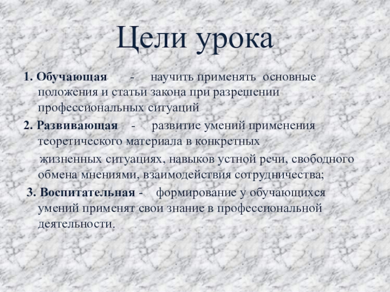 3. Воспитательная - формирование у обучающихся умений применят свои знание в профессиональной деятельности.