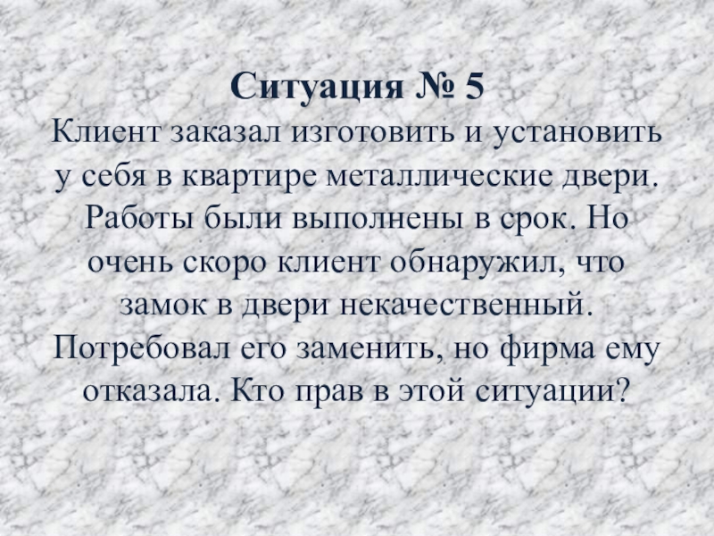 металлические двери. Работы были выполнены в срок. Но очень скоро клиент обнаружил, что замок в двери некачественный. Потребовал его заменить, но фирма ему отказала. Кто прав в этой ситуации?