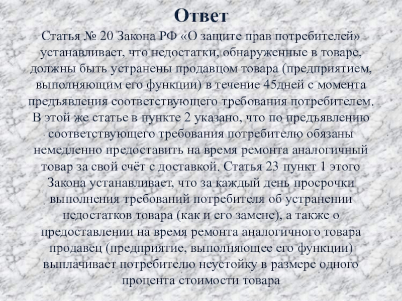 Статья № 20 Закона РФ «О защите прав потребителей» устанавливает, что