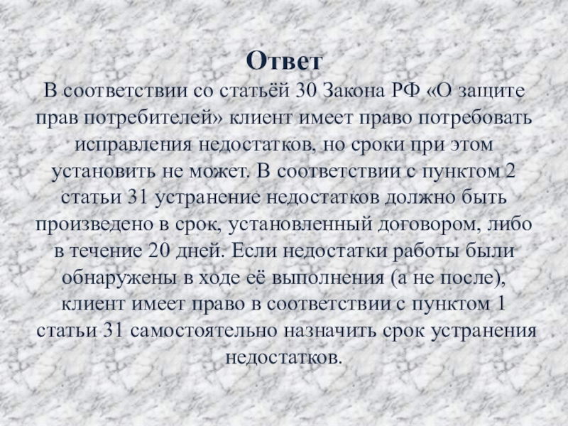 клиент имеет право потребовать исправления недостатков, но сроки при этом установить не может. В соответствии с пунктом 2 статьи 31 устранение недостатков должно быть произведено в срок, установленный договором, либо в течение 20 дней. Если недостатки работы были обнаружены в ходе её выполнения (а не после), клиент имеет право в соответствии с пунктом 1 статьи 31 самостоятельно назначить срок устранения недостатков.