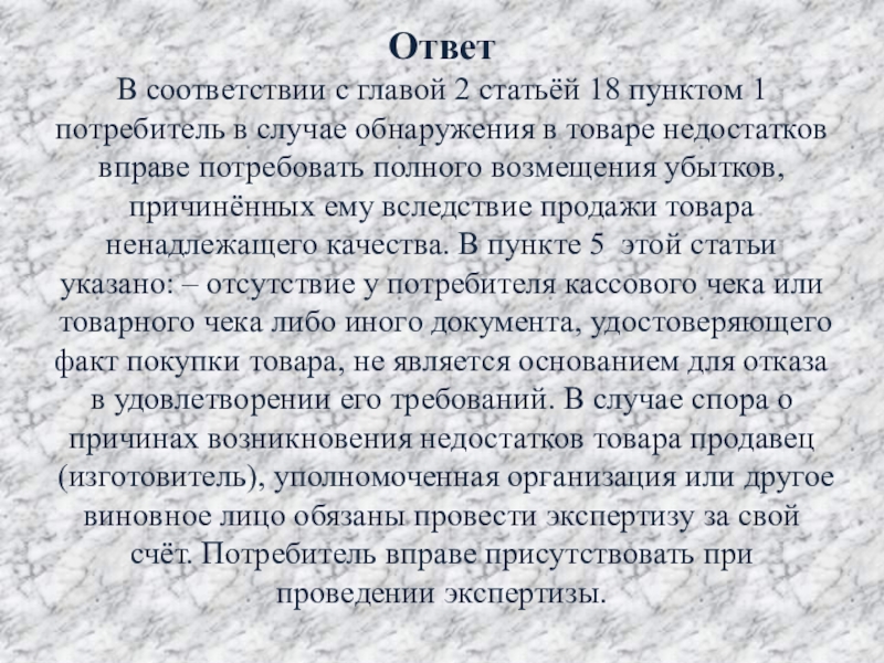 случае обнаружения в товаре недостатков вправе потребовать полного возмещения убытков, причинённых ему вследствие продажи товара ненадлежащего качества. В пункте 5 этой статьи указано: – отсутствие у потребителя кассового чека или товарного чека либо иного документа, удостоверяющего факт покупки товара, не является основанием для отказа в удовлетворении его требований. В случае спора о причинах возникновения недостатков товара продавец (изготовитель), уполномоченная организация или другое виновное лицо обязаны провести экспертизу за свой счёт. Потребитель вправе присутствовать при проведении экспертизы.