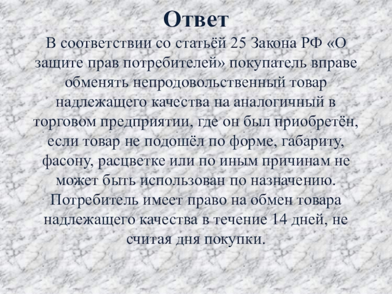 Потребитель имеет право на обмен товара надлежащего качества в течение 14 дней, не считая дня покупки.
