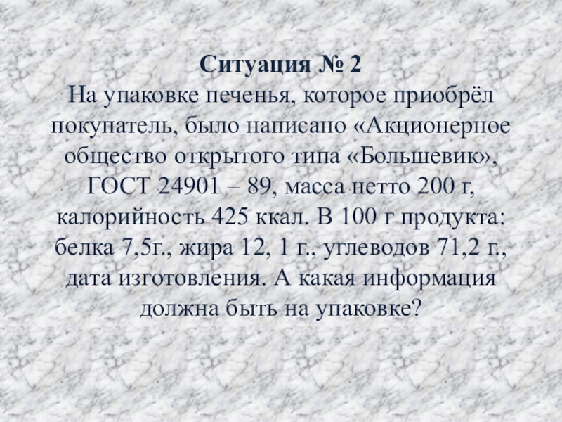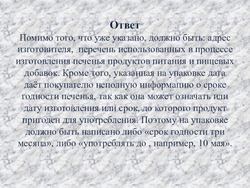 в процессе изготовления печенья продуктов питания и пищевых добавок. Кроме того, указанная на упаковке дата даёт покупателю неполную информацию о сроке годности печенья, так как она может означать или дату изготовления или срок, до которого продукт пригоден для употребления. Поэтому на упаковке должно быть написано либо «срок годности три месяца», либо «употреблять до , например, 10 мая».