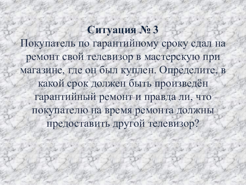 в мастерскую при магазине, где он был куплен. Определите, в какой срок должен быть произведён гарантийный ремонт и правда ли, что покупателю на время ремонта должны предоставить другой телевизор?