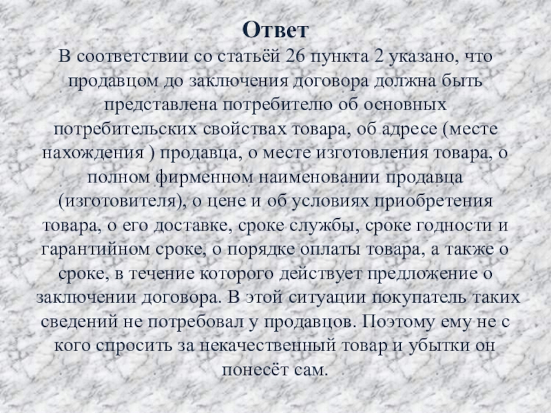 заключения договора должна быть представлена потребителю об основных потребительских свойствах товара, об адресе (месте нахождения ) продавца, о месте изготовления товара, о полном фирменном наименовании продавца (изготовителя), о цене и об условиях приобретения товара, о его доставке, сроке службы, сроке годности и гарантийном сроке, о порядке оплаты товара, а также о сроке, в течение которого действует предложение о заключении договора. В этой ситуации покупатель таких сведений не потребовал у продавцов. Поэтому ему не с кого спросить за некачественный товар и убытки он понесёт сам.