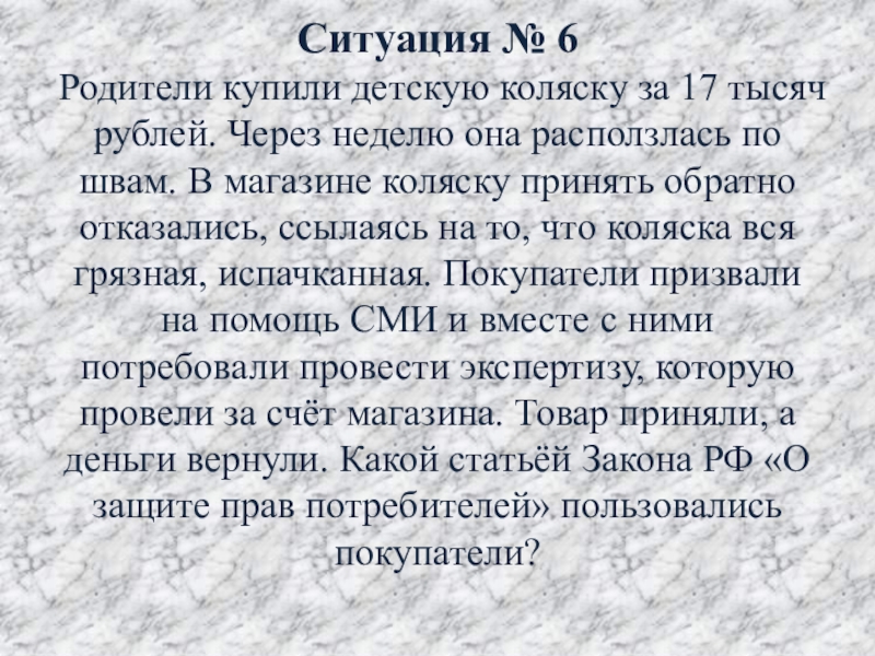 неделю она расползлась по швам. В магазине коляску принять обратно отказались, ссылаясь на то, что коляска вся грязная, испачканная. Покупатели призвали на помощь СМИ и вместе с ними потребовали провести экспертизу, которую провели за счёт магазина. Товар приняли, а деньги вернули. Какой статьёй Закона РФ «О защите прав потребителей» пользовались покупатели?