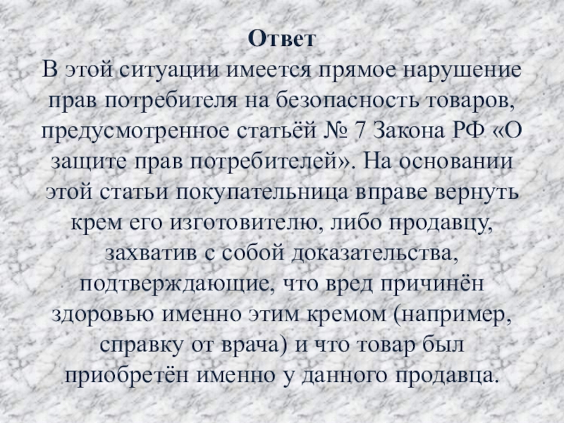 предусмотренное статьёй № 7 Закона РФ «О защите прав потребителей». На основании этой статьи покупательница вправе вернуть крем его изготовителю, либо продавцу, захватив с собой доказательства, подтверждающие, что вред причинён здоровью именно этим кремом (например, справку от врача) и что товар был приобретён именно у данного продавца.