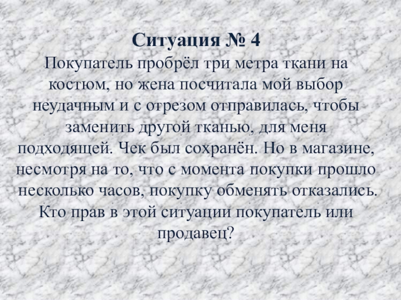 посчитала мой выбор неудачным и с отрезом отправилась, чтобы заменить другой тканью, для меня подходящей. Чек был сохранён. Но в магазине, несмотря на то, что с момента покупки прошло несколько часов, покупку обменять отказались.