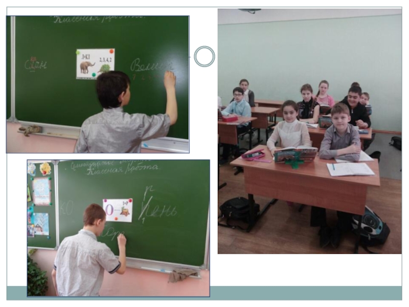 Учитель диктует слова. Ученики записывают их на доске и в тетради.