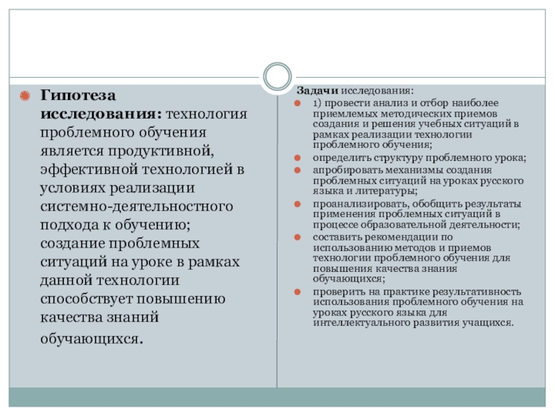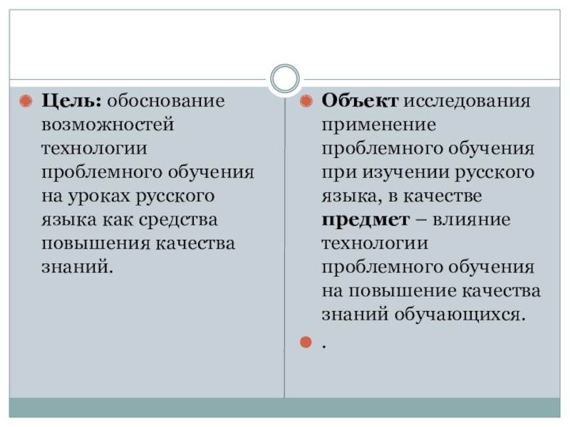 Объект исследования применение проблемного обучения при изучении русского языка, в качестве предмет – влияние технологии проблемного обучения на повышение качества знаний обучающихся.