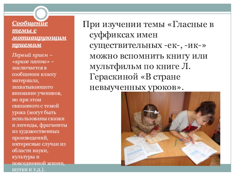 При изучении темы «Гласные в суффиксах имен существительных -ек-, -ик-» можно вспомнить книгу или мультфильм по книге Л. Гераскиной «В стране невыученных уроков».