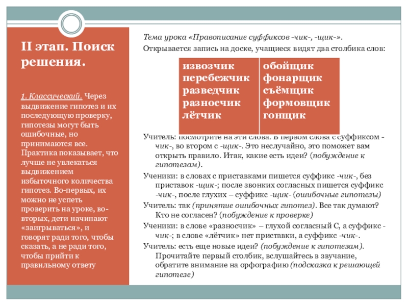 Учитель: посмотрите на эти слова. В первом слова с суффиксом -чик-, во втором с -щик-. Это неслучайно, это поможет вам открыть правило. Итак, какие есть идеи? (побуждение к гипотезам).