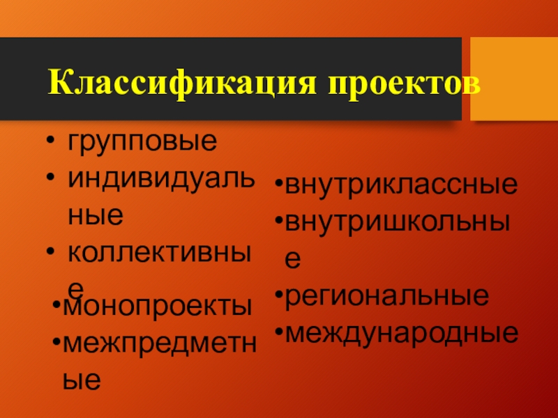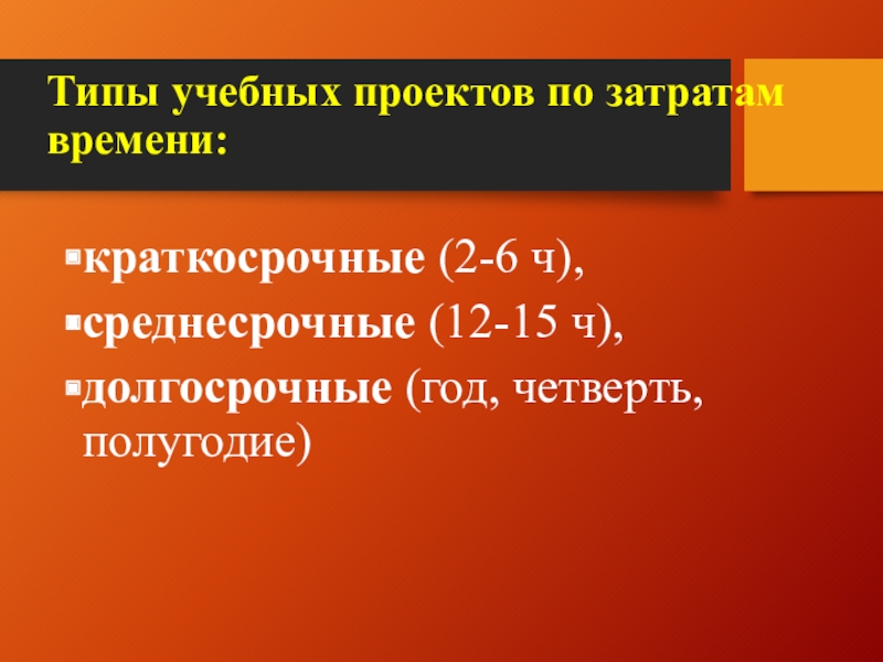 Типы учебных проектов по затратам времени:краткосрочные (2-6 ч),среднесрочные (12-15 ч),долгосрочные (год, четверть, полугодие)