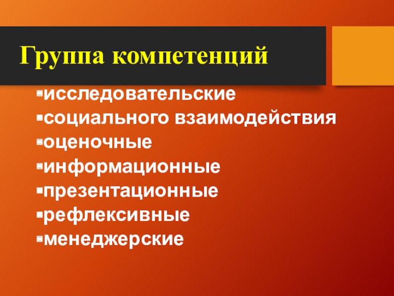 Группа компетенцийисследовательскиесоциального взаимодействияоценочные информационные презентационные рефлексивныеменеджерские