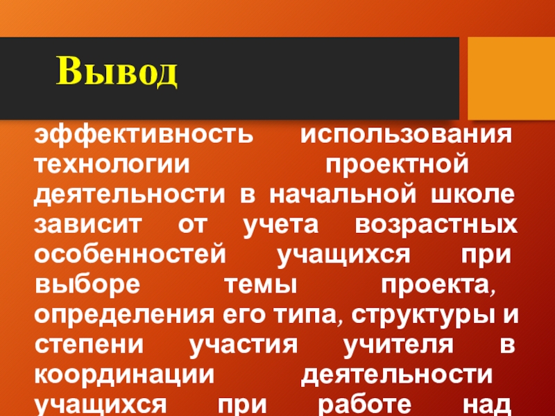 Выводэффективность использования технологии проектной деятельности в начальной школе зависит от учета возрастных особенностей учащихся при выборе темы